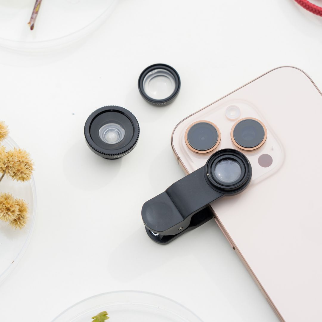 Accesorio clip para celular con lentes intercambiables.